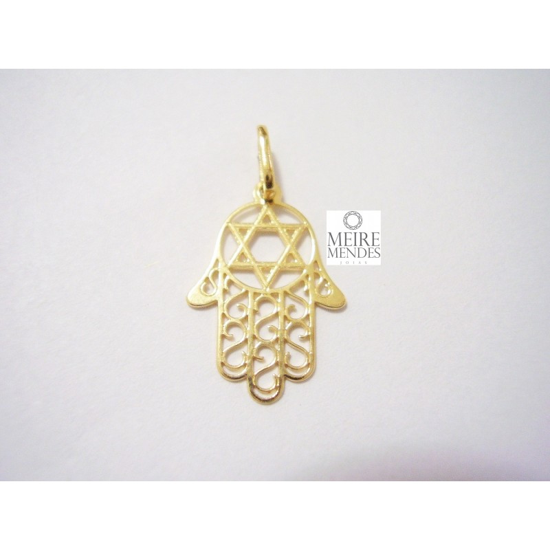 Pingente mão de fátima com estrela de davi, vazado, em ouro amarelo 18 k.