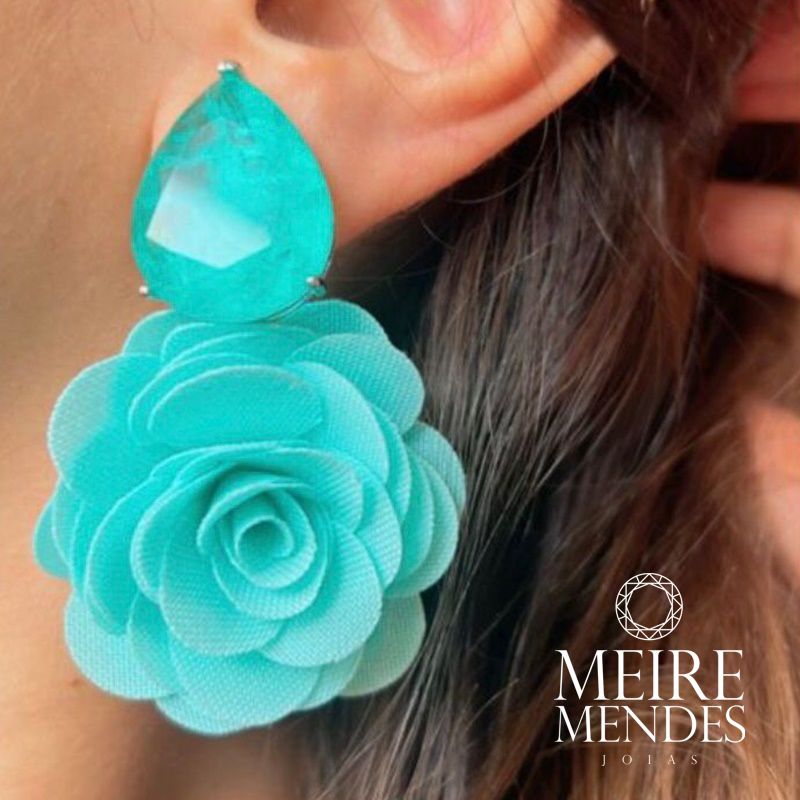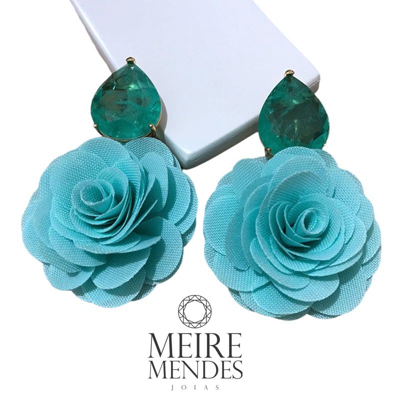 Brinco banhado a ouro amarelo 18 k, com flor de tecido na cor verde água e com pedra gota fusion turmalina. Pode ser usado com ou sem a flor. Tamanho: 4,5 cm de largura x 7,0 cm de altura