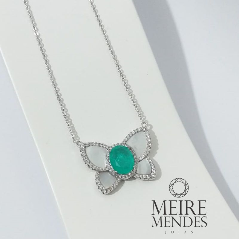 Gargantilha banhada a ródio, com pingente borboleta de madrepérola, fusion e micro cravação na volta toda.
